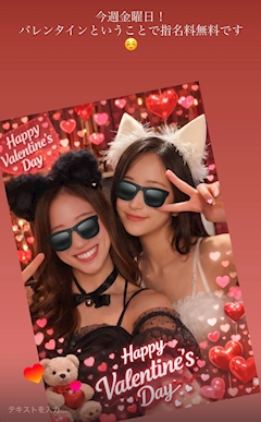 こんばんはりのです🥹➰ お久しぶりのブログすみません、、 先週は猫耳🐈⬛ 私は猫の耳を髪の毛で作った、、けど再来週はコスプレするーーーー🥹 コスプレ届いたヨ 今日はバレンタインデー‼️ということで毎年恒例お菓子の詰め合わせ‼️ 1番楽です︎^_^ とわさんの生チョコタルトとみゆちんの生チョコタルトゆらからのお菓子とても美味しかった🤤 手作り作ってみるのもありかなあ、、 みんなにメッセージ付きの詰め合わせを渡しました‼️ りささんに一番最初にあげたくてタイミングを見てたら1番に渡せて嬉しかった✨✨写真も撮れて幸です♥️♥️ るなちと初ツーショ‼️ ずっと撮りたかったから嬉しすぎた🥹🤍 今日も出勤‼️21:30〰️‼️ 猫コスのりのみゆち 昨日のるなちりの 昨日のりのりささん みんな大好き🥹